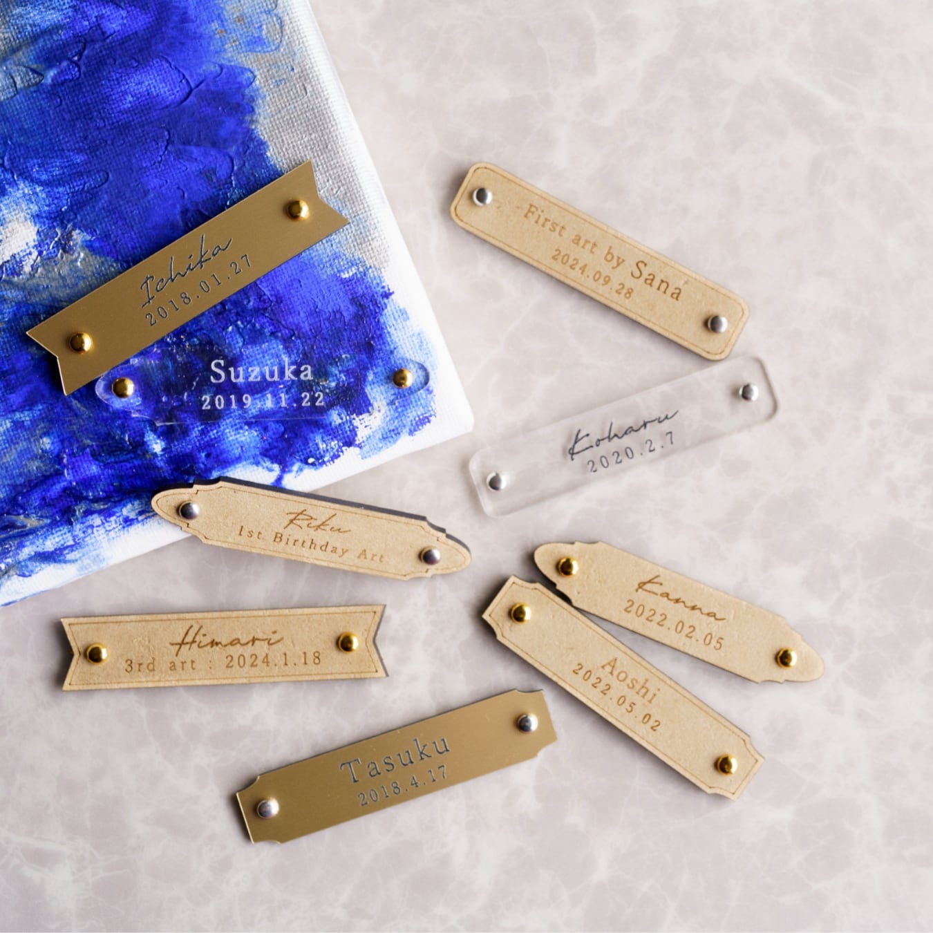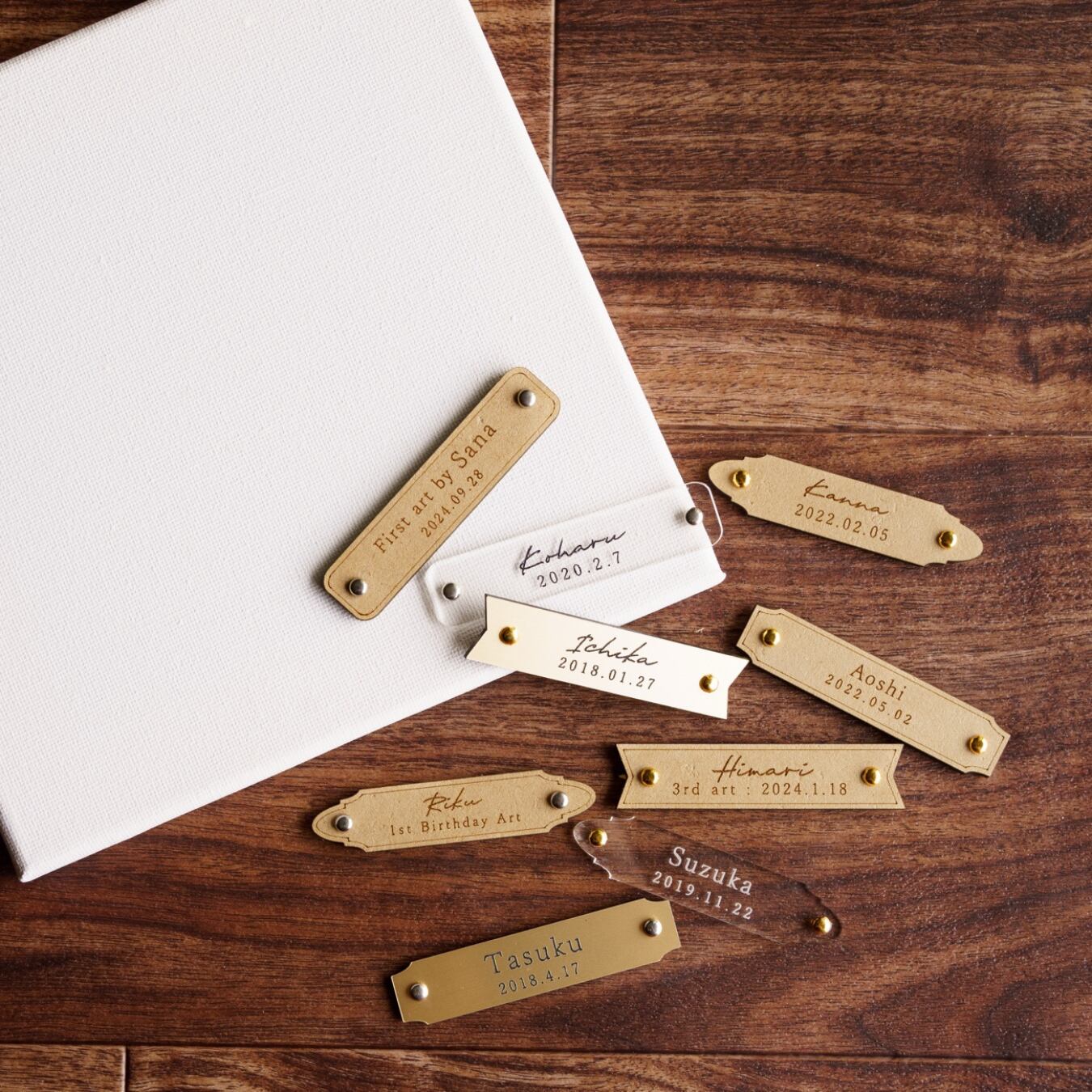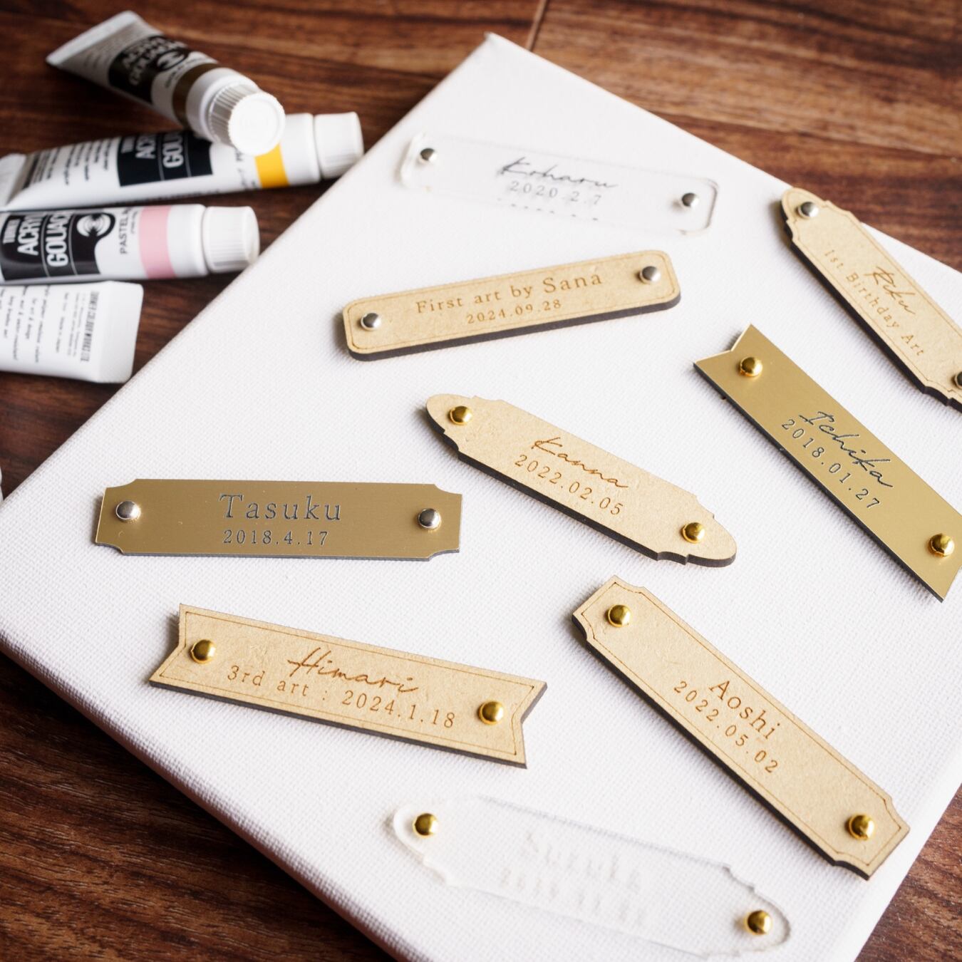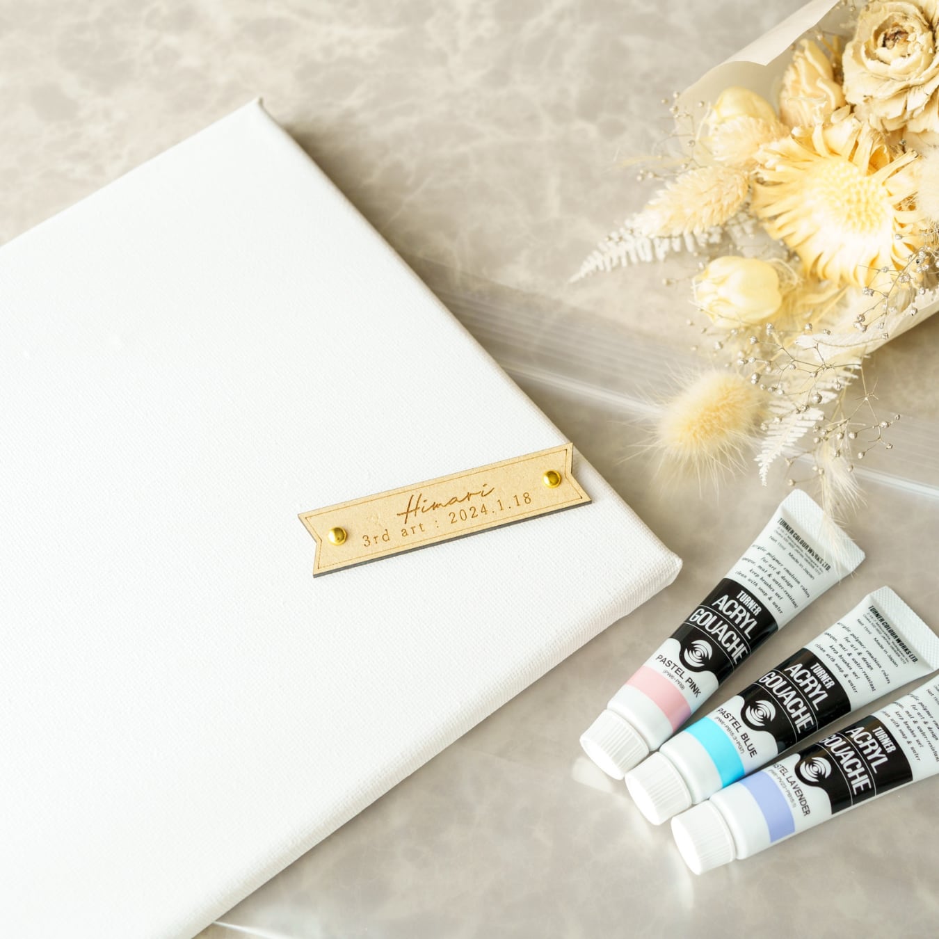 アクリル絵の具・キャンバス・名入れタグ・手順書など、必要なものがすべて揃った オールインワンセット。買い足し不要で、すぐに制作を楽しめます。